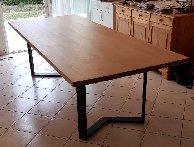 Ce plateau de belle taille (épaisseur 40 mm) a été réalisé avec mon ancien combiné-bois beaucoup plus petit que l'actuel et surtout moins précis. Bref, la partie dégauchissage a été un peu laborieuse ! Ensuite, la commande était de garder les plateaux les plus larges possibles. Nous avons ici des planches jusqu'à 260 mm et c'est beaucoup, certains diront trop... Elles ont été collées à plat-joint.